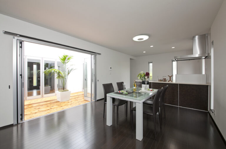 ──そんなご希望から始まった住まいづくり。キッチンは、料理をしながらご夫婦の会話が弾む対面型に。光庭には大きな窓を設け、外からの視線を遮りつつも、やわらかな自然光が差し込む明るい空間を実現しました。