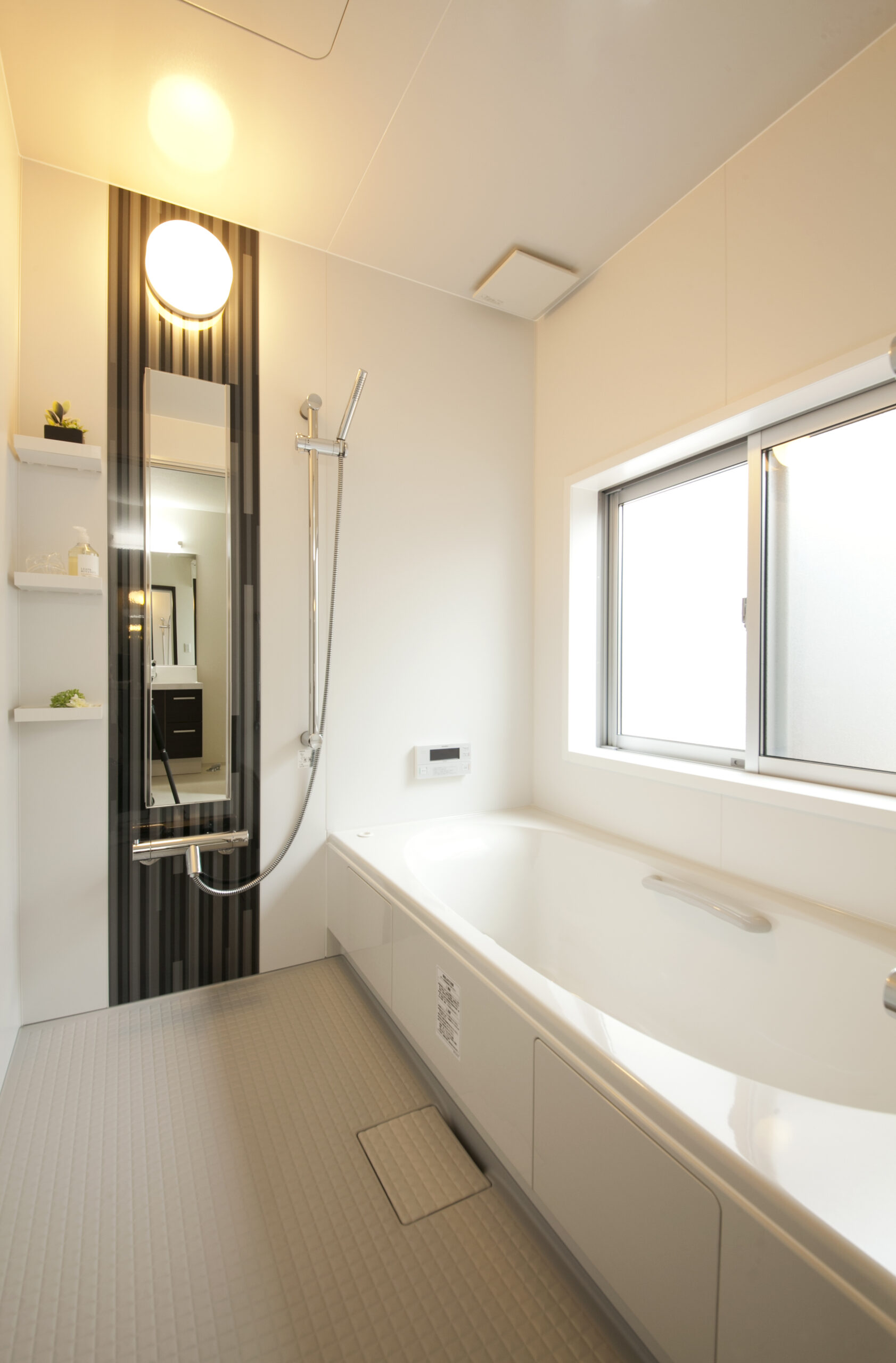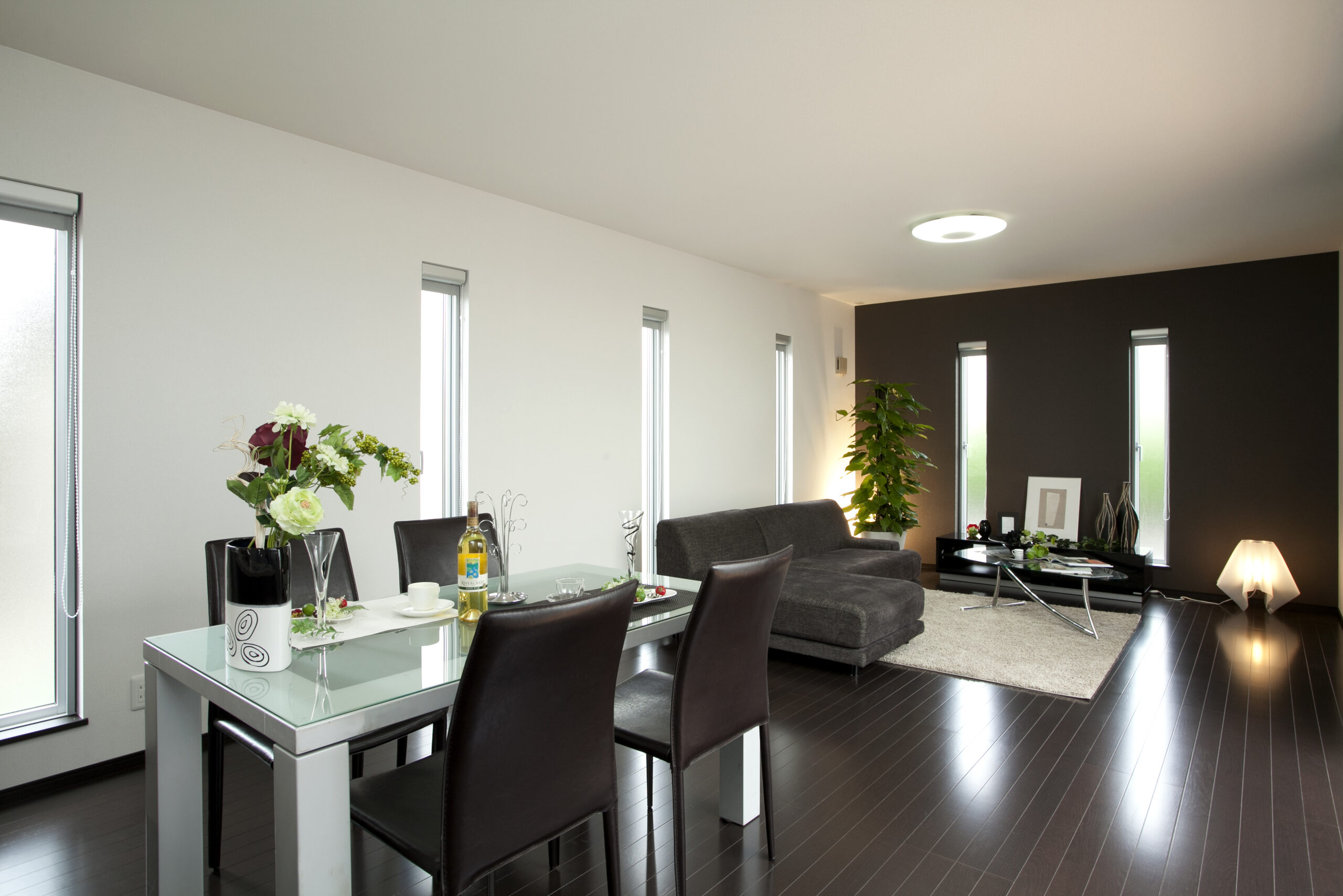縦ラインの美しい玄関ドアと窓が、スタイリッシュな印象を演出しています。平屋だからこそのつながりと、心地よい距離感。